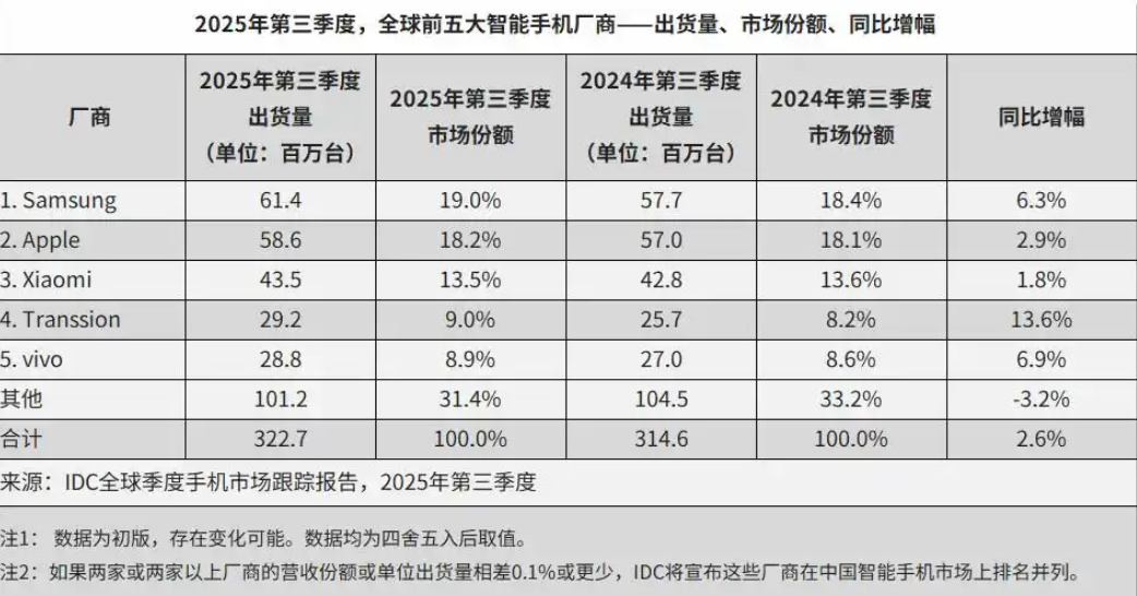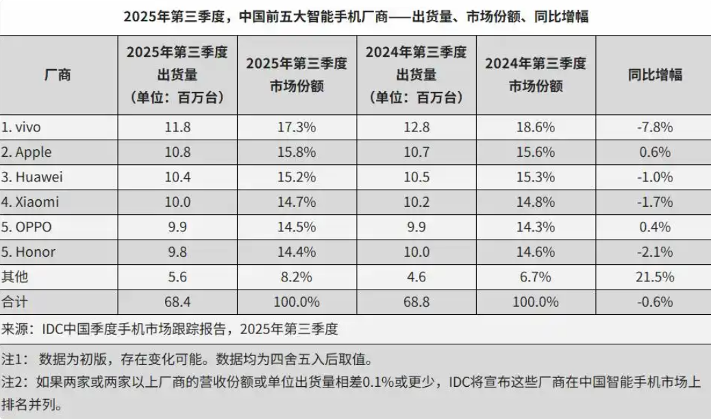 根据IDC最新数据,2025年第三季度,荣耀在中国市场的出货量排名与OPPO并列第五。